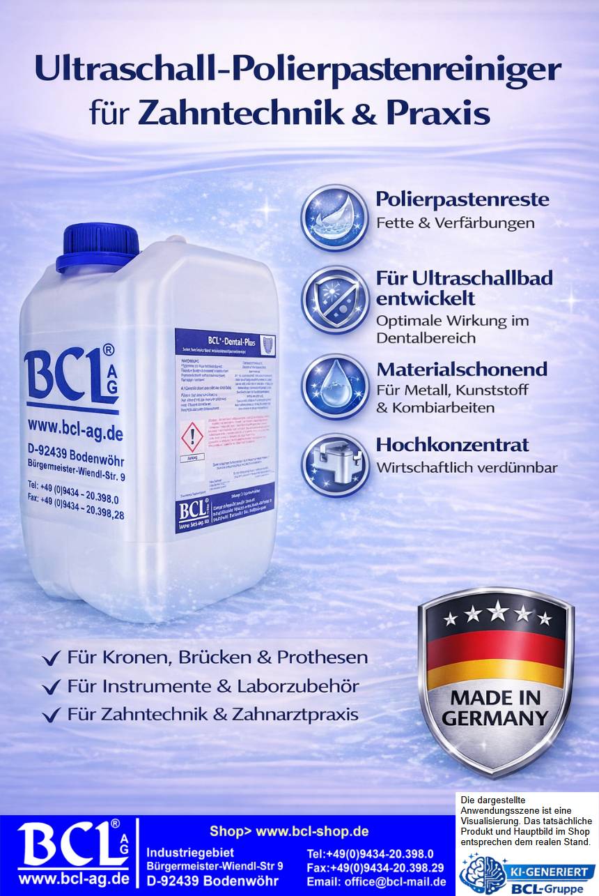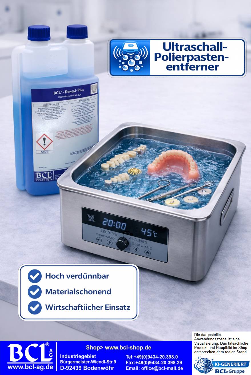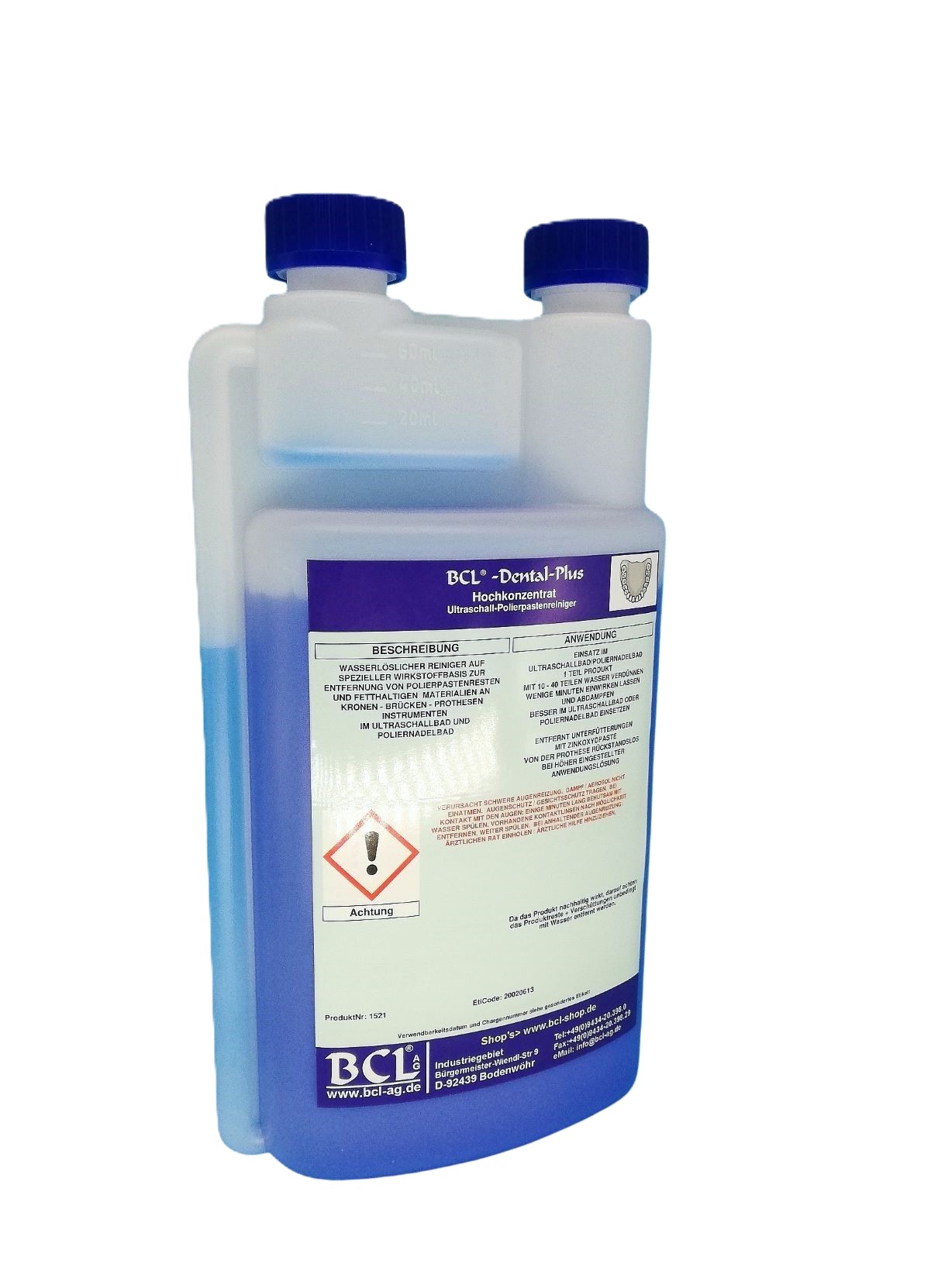 Der Ultraschall-Polierpastenentferner BCL®-Dental-Plus ist ein wasserlöslicher und hochkonzentrierter Reiniger auf spezieller Wirkstoffbasis zur professionellen Reinigung dentaler Werkstücke im Ultraschallbad.
