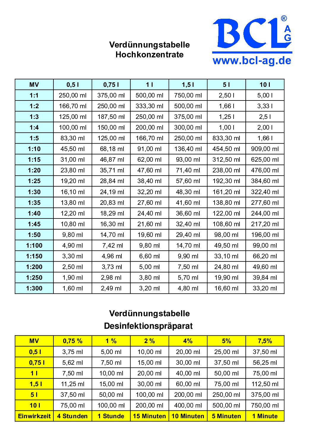 1 Teil Produkt mit 10 – 40 Teilen Wasser verdünnen, wenige Minuten einwirken lassen und abdampfen.